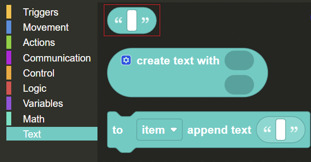 Poté v nabídce Text v panelu nástrojů najdete bubliny pro řetězce. Text uvnitř těchto bloků kódu se nazývá řetězce.