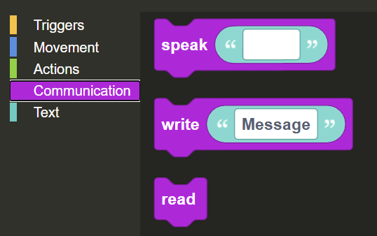 Træk speak-blokken fra communications-menuen i din værktøjskasse til Blokeditoren. Når du er i Blokeditoren, skal du klikke på tekstfeltet inde i speak-blokken og skrive "Hello".
