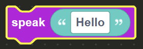 For at råbe "Hello" skal du bruge speak-blokken og indtaste teksten "Hello" i tekstfeltet.