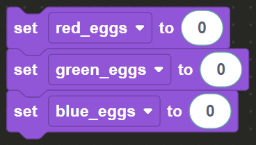 ספור כמה ביצים איגדת מכל סוג, והשתמש בבלוק set variable כדי להגדיר את הכמות בכל משתנה. גרור ושחרר בועות מספרים מתפריט Math אל תוך בלוק set variable – מספר הביצים מכל סוג מוצג בפינת המסך העליונה הימנית.