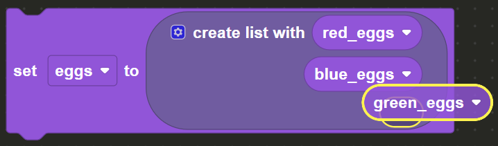 פה הדברים הולכים אחרת: מתפריט Lists בכלי, גרור ושחרר את בלוק create list ושם אותו בתוך בלוק ה-set variable. בשלושה המקומות במשחק, הכנס את שלושת המשתנים שיצרת קודם: red_eggs, blue_eggs, green_eggs.