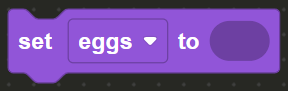 ראשית, צור משתנה בשם eggs באמצעות לחצן 'צור משתנה' בתפריט Variables. משם, גרור ושחרר את בלוק set variable לעורך הבלוקים והגדר אותו למשתנה eggs.