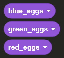 אסוף את כל הביצים בכל צבע בשדה: ביצים אדומות, ירוקות וכחולות. לאחר שיאספו כולן, צור משתנים: red_eggs, blue_eggs, green_eggs על-ידי לחיצה על הכפתור 'צור משתנה' בתפריט המשתנים.