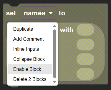 Depois de terminar de colocar a comida em ambas as marcas X escuras, dirija-se à marca X clara e fique de frente para o chiqueiro. Chame os leitõezinhos para que possam vir comer. Os nomes deles são "Peggle", "Peter", "Piper" e "Pedro". Para facilitar chamá-los, coloque seus nomes em uma lista. Há um bloco set variable / create list no editor contendo uma lista intitulada names. Ative o bloco e preencha os itens faltantes.