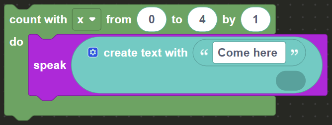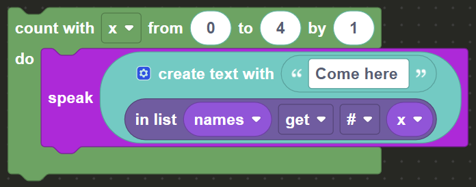 Dentro do loop, use o bloco speak com um bloco create text para combinar a string "Come here " com a variável x (que conterá cada nome conforme o loop avança). No editor de blocos, você encontrará os blocos desativados; ative-os e finalize a sequência de blocos adicionando os itens no segundo espaço do bloco create text.