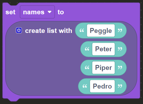No menu Text, posicione quatro blocos string dentro do bloco create list. Dentro deles, coloque os nomes dos quatro leitõezinhos nesta ordem: "Peggle", "Peter", "Piper", "Pedro".