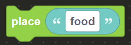 Os leitõezinhos provavelmente estarão com fome em breve. Pegue o grande saco azul de comida e dirija-se às duas (2) marcas X escuras no mapa. Arraste e solte o bloco place do menu Actions no editor de código nas duas (2) marcas X escuras e vire-se para as bandejas. Arraste e solte o bloco string do menu Text nos blocos place e adicione a palavra "food" na bolha de texto. Isso vai despejar a comida do saco nas bandejas para os leitõezinhos comerem.