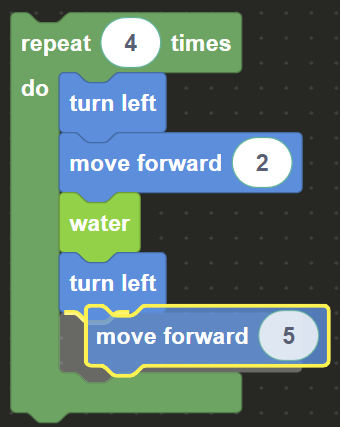 Pentru a finaliza acest nivel folosind doisprezece (12) sau mai puține blocuri, folosește blocul repeat.